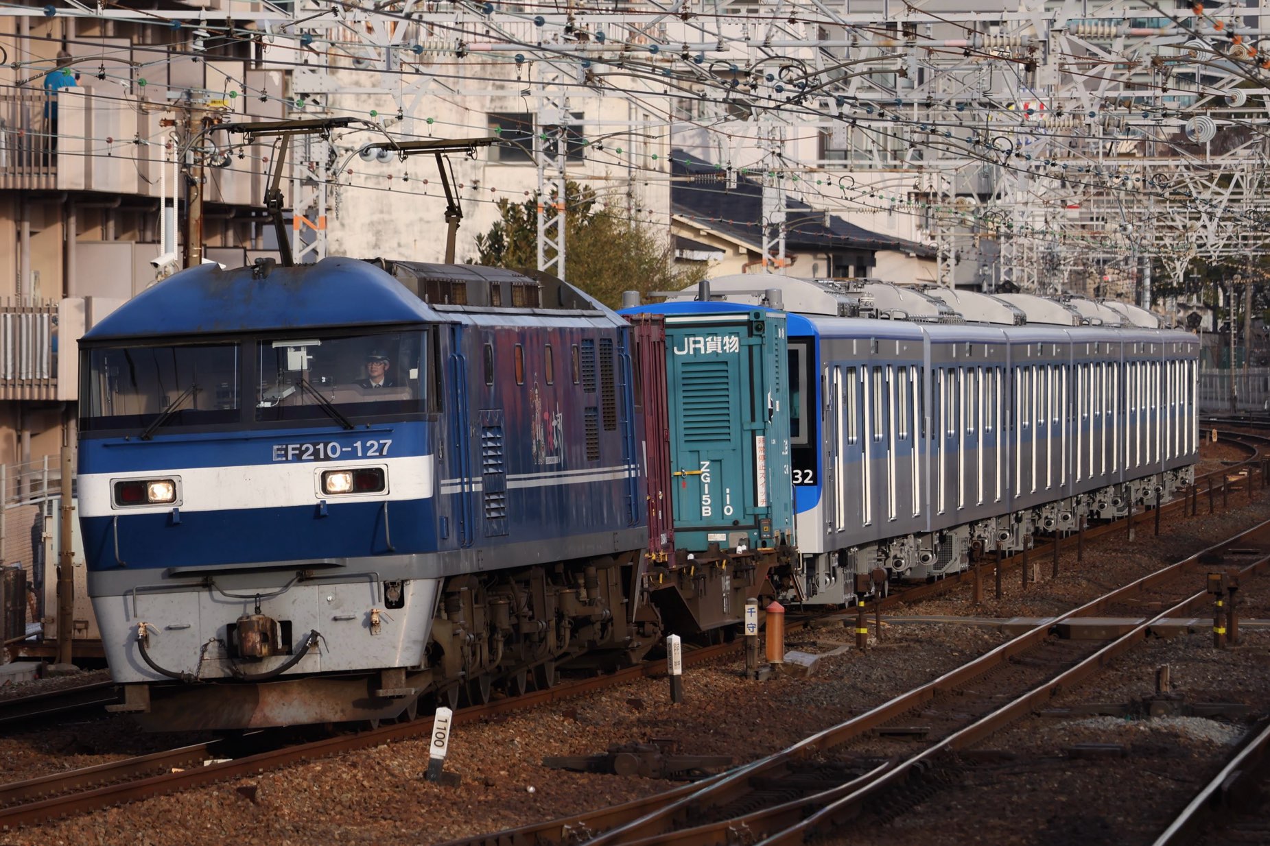 向こうにいるコンテナ貨物はEF210牽引で同じ方向に並走しています。