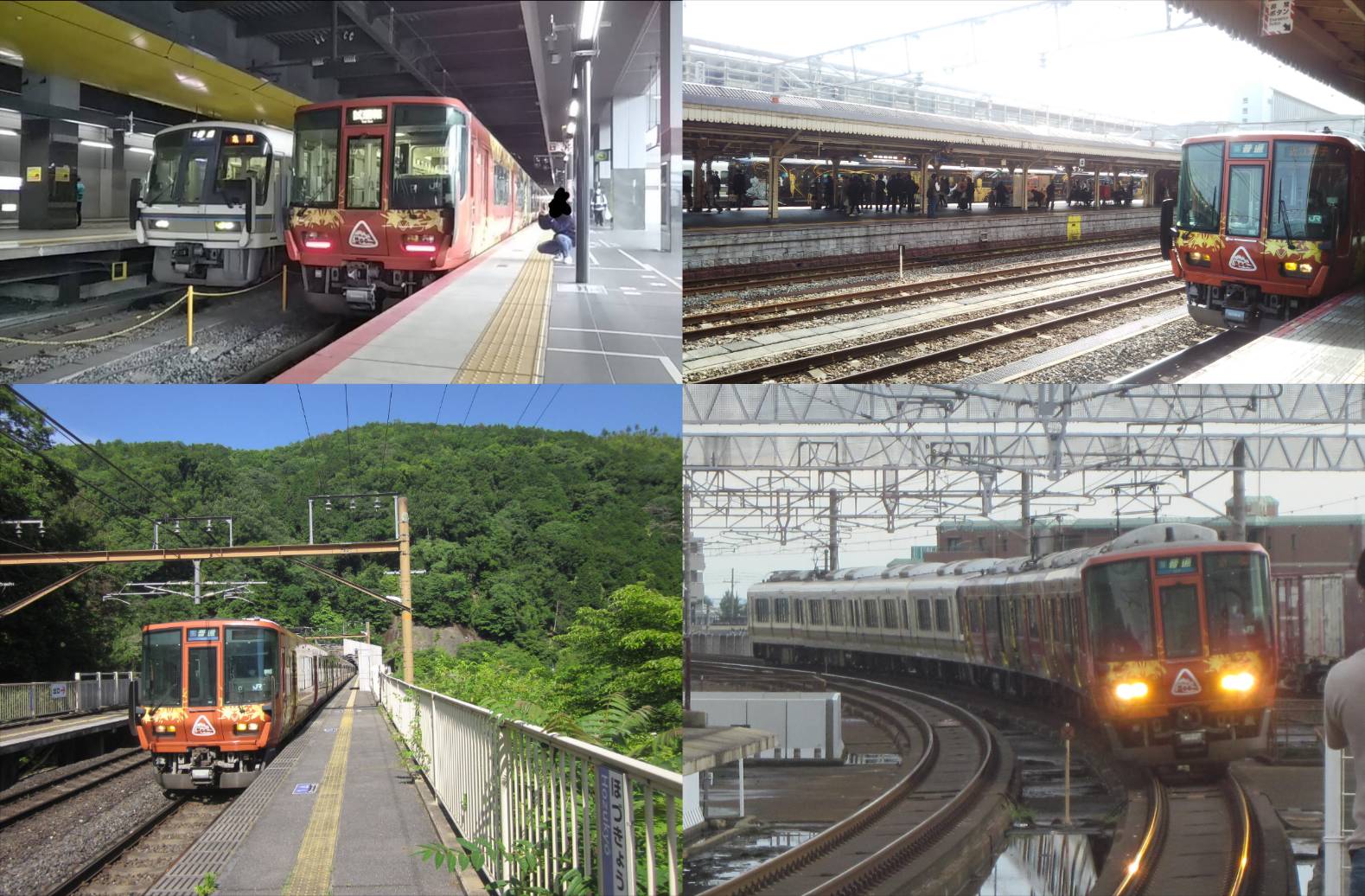 右下:嵯峨野路を離れ湖西路を走るQRトレイン。運行当初から湖西線方面にも顔を出すことがあったので、折をみては撮影に行っていました。草津線にも顔を出してくれないものかと思っていましたが、結局2024年3月まで待つことになりました。2022/08/24、大津京